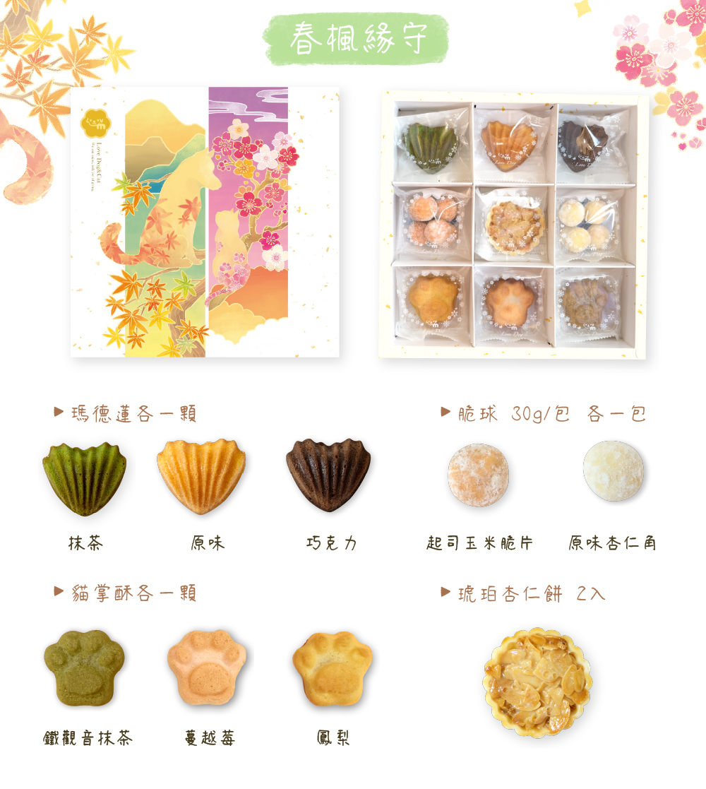 - 保存期限:貓掌酥20天、脆球45天、瑪德蓮14天、琥珀杏仁餅20天