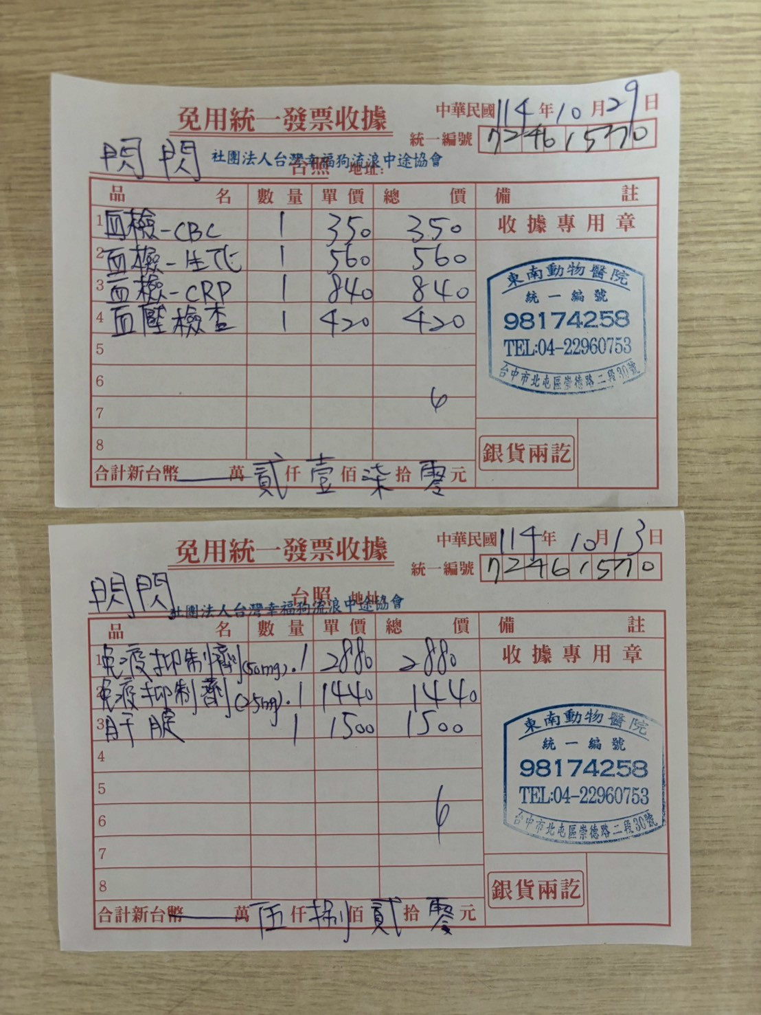 愛媽六點多出門幫閃閃去台中中興大學教學醫院掛號 閃閃已經連續三天高燒40度以上不退 虛弱到無力起身,雞肉粥也只能小口小口硬塞 愛媽果然還是第一位到場排隊抽一號號碼牌 07:30到醫院看完診辦好住院已經下午一點 再度抽血並聽從醫師志工建議驗ANA抗體力價,懷疑是自體免疫性疾病像紅斑性狼瘡之類~ 因為臨床上的症狀許多相同:不斷發燒、體重下降、口腔潰瘍、四肢關節疼痛、強烈發炎、全身無力、嚴重貧血…. 但等檢驗結果還要7天 擔心閃閃撐不了 醫生決定先住院打類固醇治療並監控身體各項變化! 醫生說如果一直貧血下去可能也需要輸血~ 親人親狗的閃閃配合度超高乖乖打點滴 今天檢查花了8640元CT報告2500元住院點滴抽血七天估計45000元 閃閃兩個月來的檢查治療已經花費50000元雖然負擔很大 但是從小救援了三年,我就是妳的家人,會盡力守護妳,只希望妳能勇敢挺過去🙏
